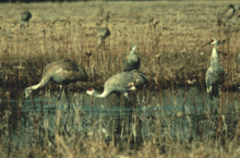 Cranes in a wet meadow.