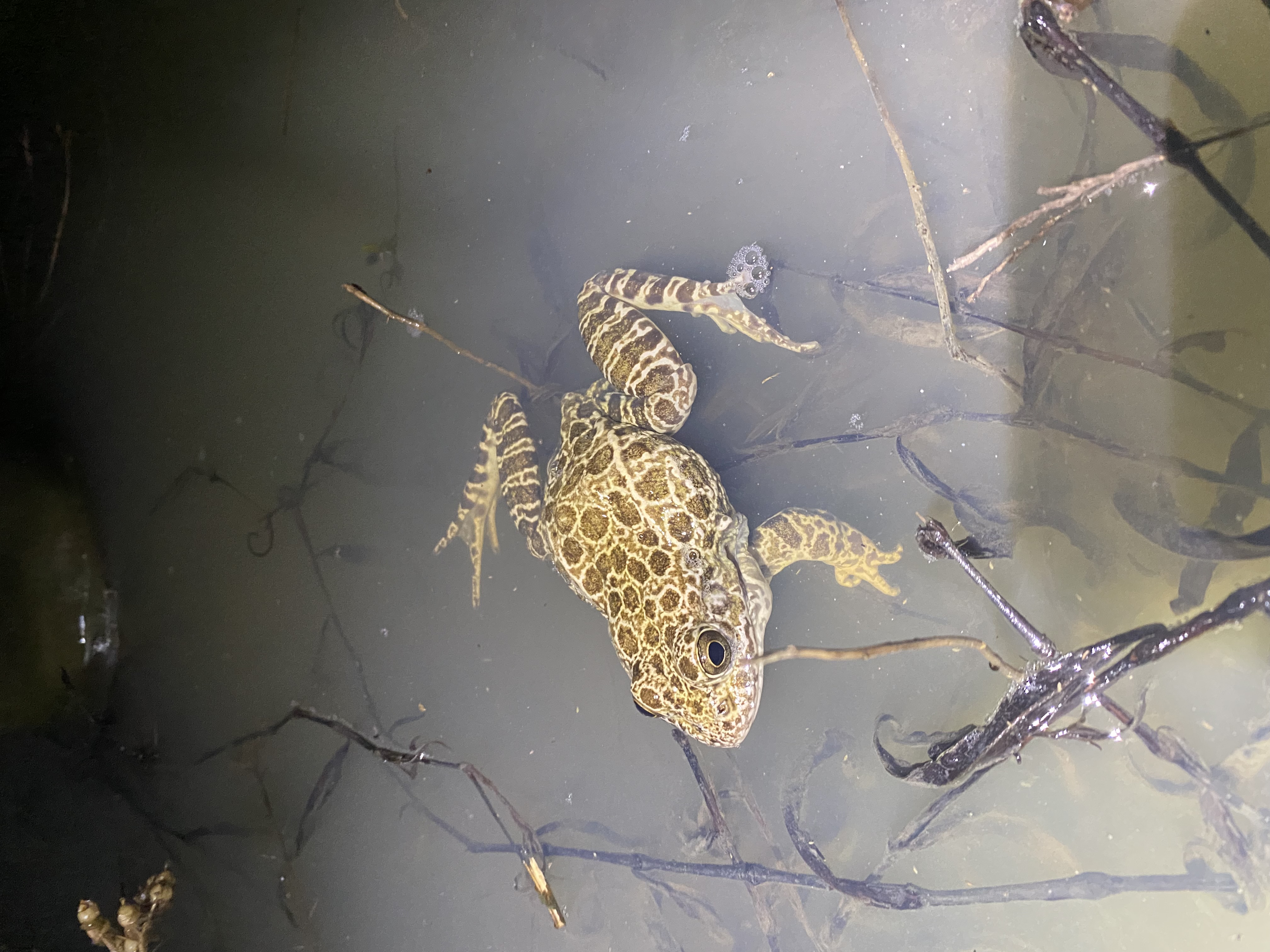 Crawfish frog in its breeding wetland, this frog was captured and outfitted with radio-transmitters to understand how far from the wetlands they travel after breeding season ends.