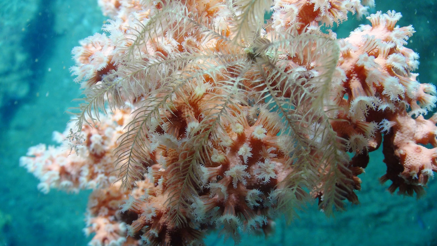 Close-up of a crinoid attached to bubblegum coral (Paragorgia). The coral's polyps are extended in feeding position. Both animals capture small organisms and organic matter in the water column as it drifts by.