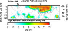 Cross-section of slip distribution for the September 29, 2009 M8.1 earthquake in the Samoa Islands region. The strike direction is indicated above each fault plane and the hypocenter location is denoted by a star. Slip amplitude is shown in color and the motion direction of the hanging wall relative to the footwall (rake angle) is indicated with arrows. Contours show the rupture initiation time in seconds. For more discussion, see the USGS Finite Fault page for this event.