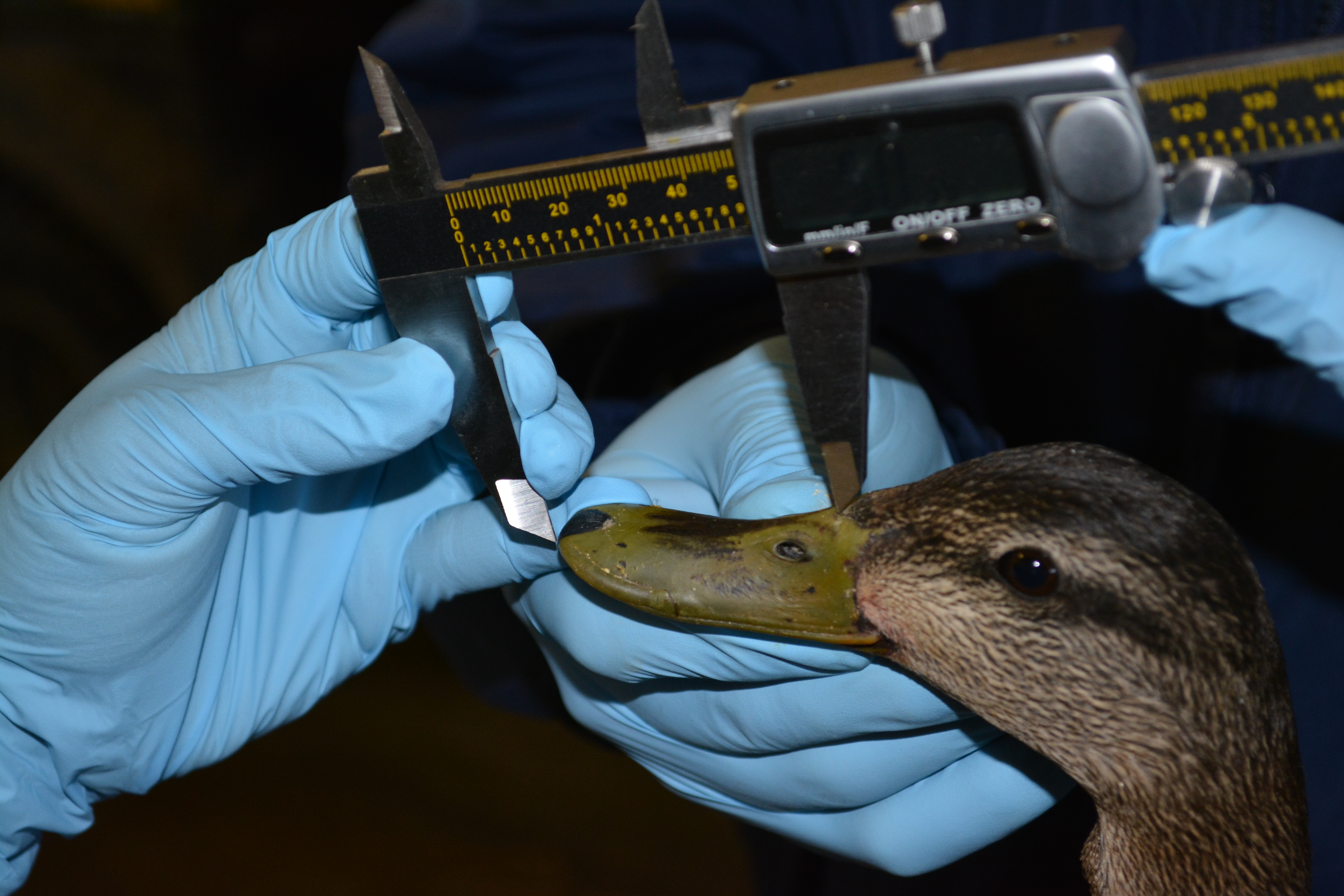 Morphometrics being taken on an American black duck (Anas rubripes) during sampling for avian influenza virus