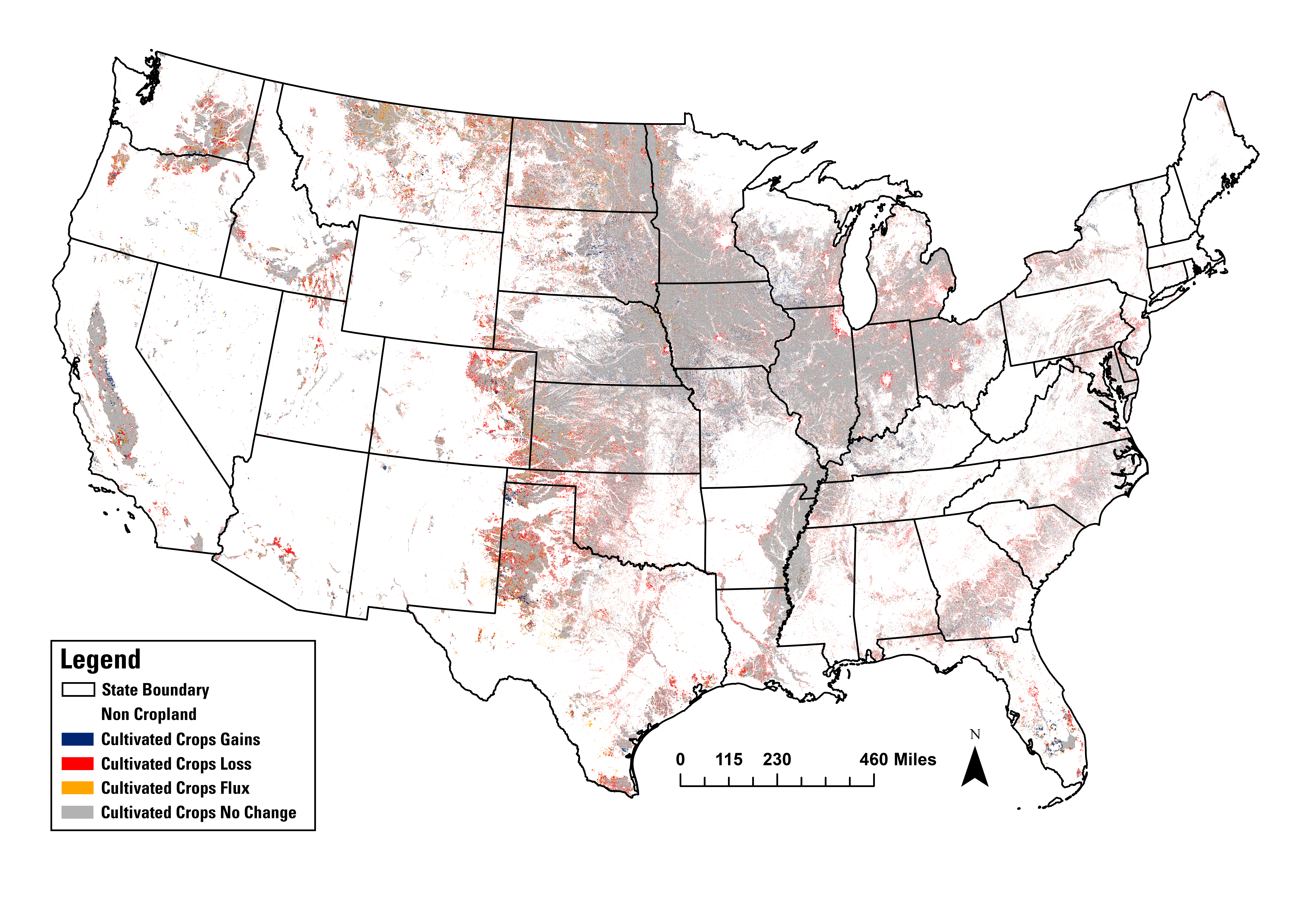 A map of cropland across the lower 48 states showing cropland gains, losses, flux, and stability (no change) from 1985 to 2023, calculated from the Annual National Land Cover Database (NLCD). The gray color represents stable cropland. The red are pixels that changed from cropland (loss). Blue represents areas that became cropland (gain). Orange shows areas in flux, that changed over time from cropland to grassland, typically, and then back to cropland again.