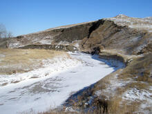 This cut bank (with landslide slump) is along a meander in Sage Creek near where the Sage Creek Rim Road crosses the stream (frozen). The dark, organic-rich gray shale formed from sediments deposited in the ancient Western Interior Seaway. During the Cretaceous Period, the Western Interior Seaway covered most of the region of what is the Great Plains today. It extended from the Arctic region, southward to the Gulf Region (NPS, 2008).