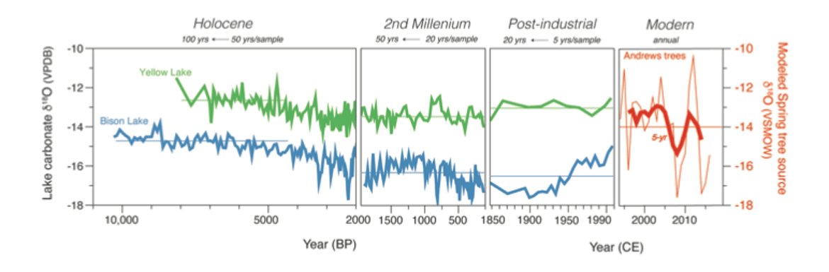 The sediment record pulled from Yellow Lake (green) and Bison Lake (blue) starts in the Holocene. The record pulled from the trees in Andrews Meadow shows the Modern period. Both show wet and dry extremes over the years.