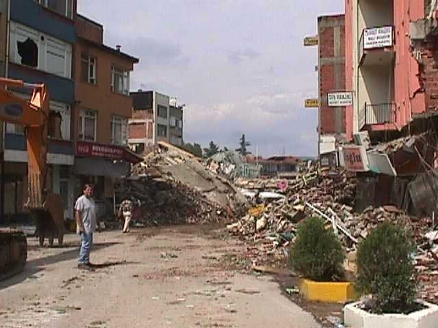A man stands next to the rubble of damaged buildings in the earthquake region.