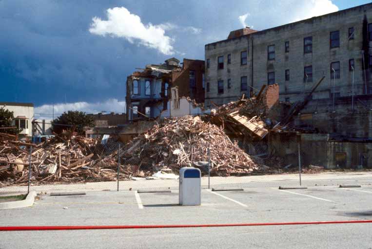 Partially razed earthquake-damaged unreinforced-masonry buildings in Old Town historical district, City of Salinas.