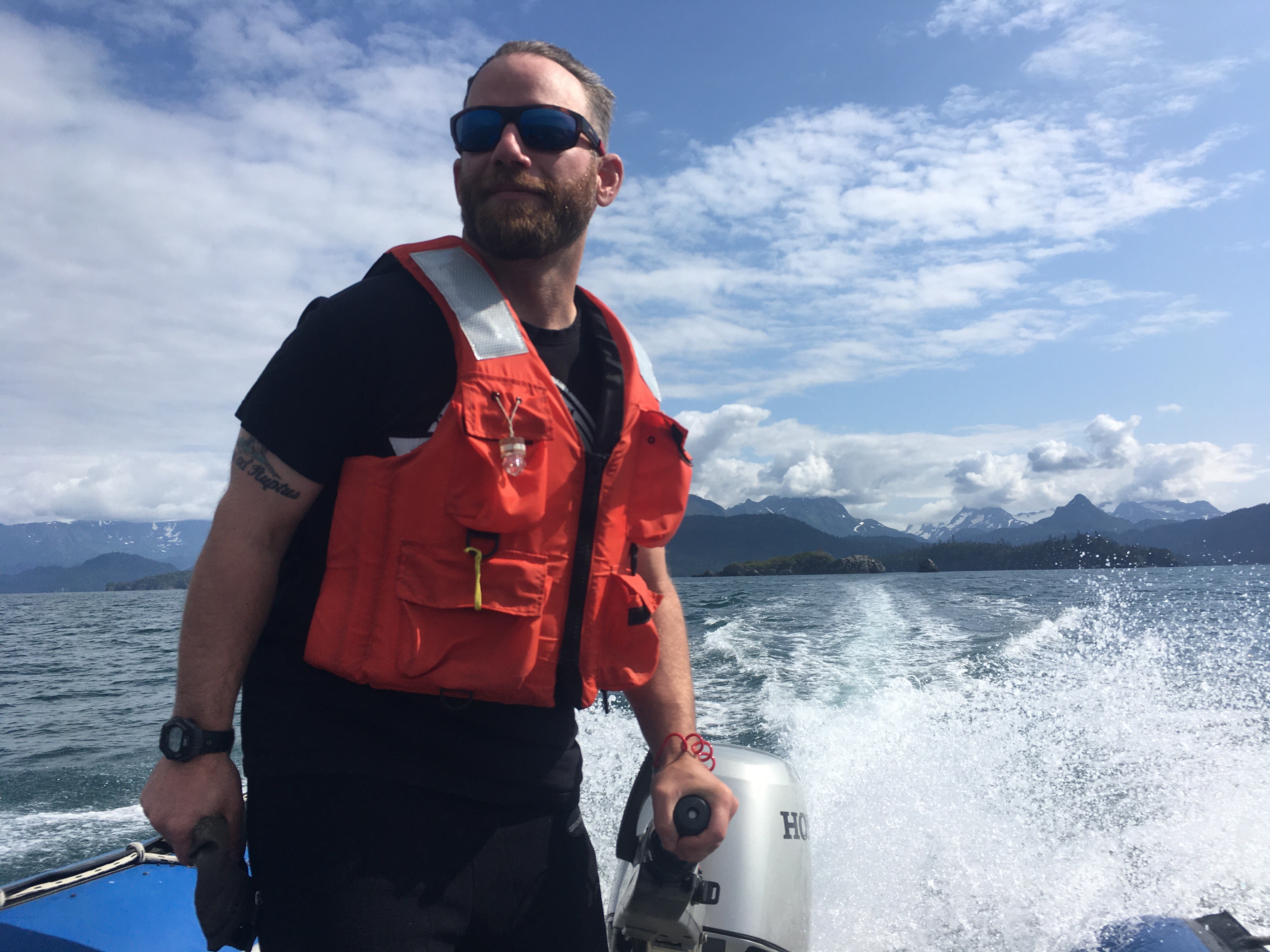 Daniel Donnelly, USGS Biologist in orang life vest and sunglasses in small motorboat conducting field work. Dan is a member of the Seabird and Forage Fish ecology group at the Alaska Science Center.