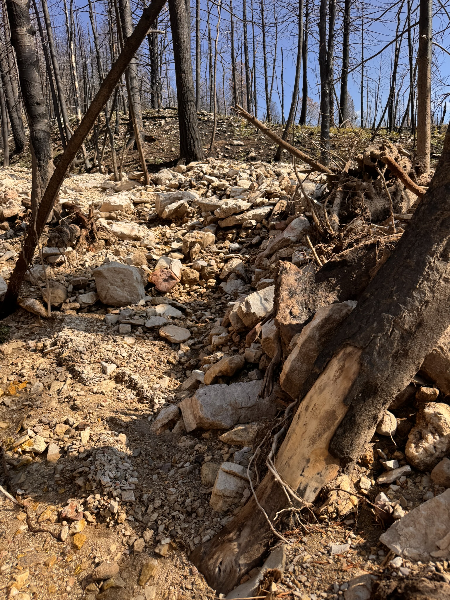 Debris-flow deposit in the 2024 Elk Fire burn area near Dayton, Wyoming. A close-up view of a debris-flow deposit located in the upstream section of a burned watershed. This deposit is poorly sorted, and contains mud, gravel, boulders, and woody debris. Damaged bark on the tree in the foreground suggests impact from larger material carried by a fast-moving flow.
