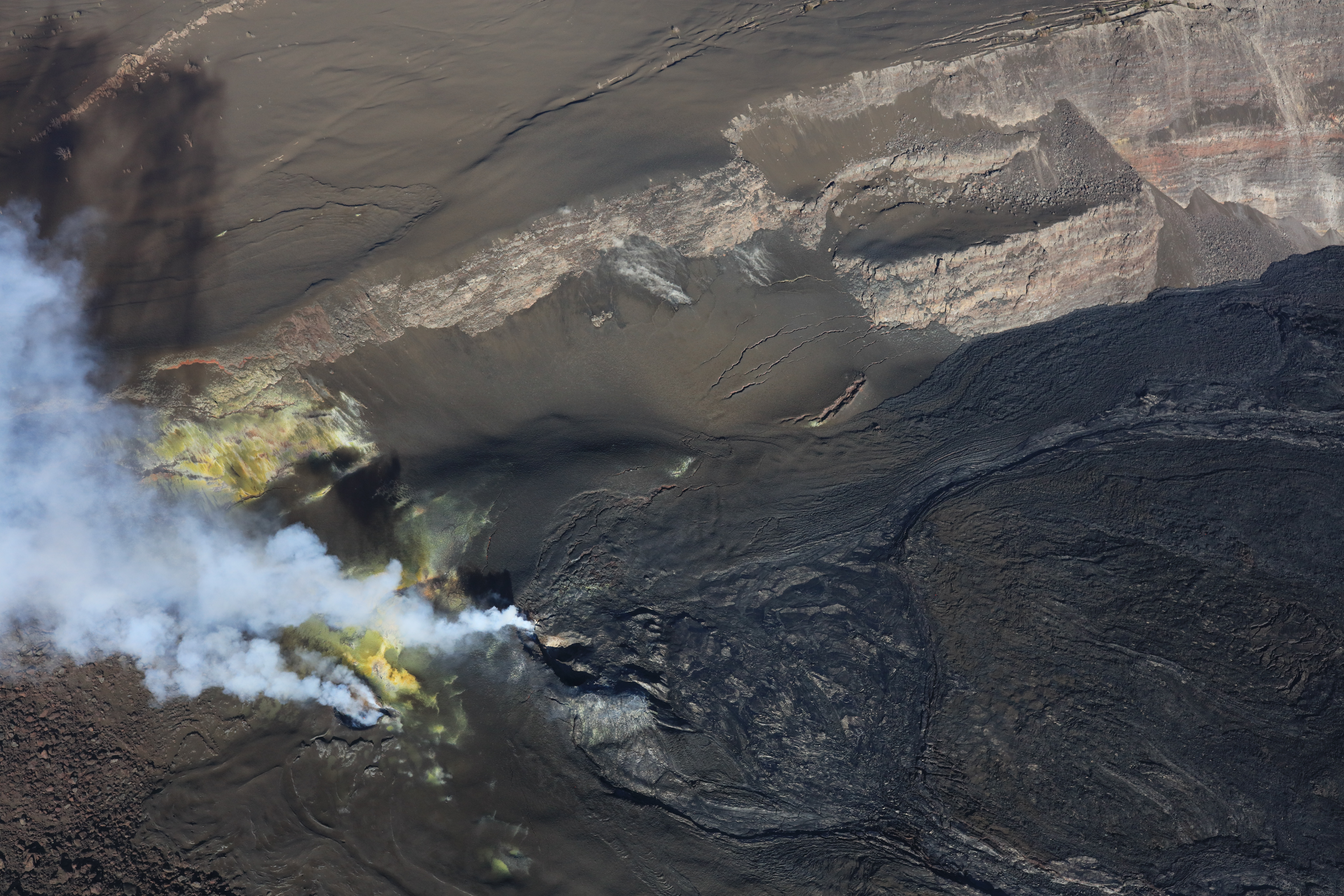 An aerial view of the north (right) and south (left) vents in Halema'uma'u, taken during a USGS Hawaiian Volcano Observatory monitoring overflight the morning of December 2, 2025. Both vents were actively degassing, and a spattering lava surface was visible deep within their conduits. USGS photo by D. Downs