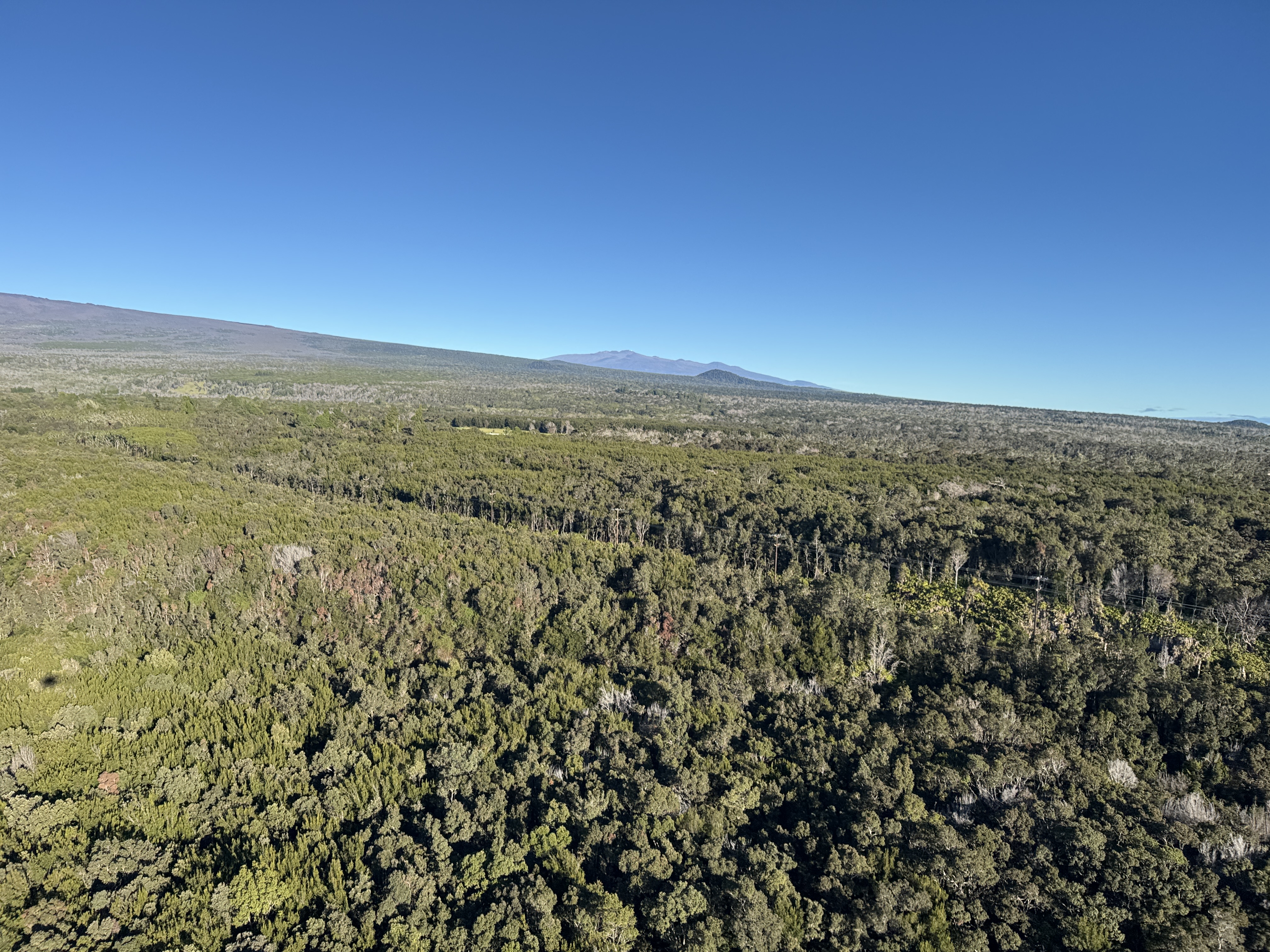This aerial photograph shows Kīlauea, Mauna Loa and Mauna Kea. In the foreground is the forested area just north of Kīlauea caldera; the slope of Mauna Loa's Northeast Rift Zone rises to the left side of the image, while Mauna Kea is visible in the background. USGS photo by K. Mulliken.