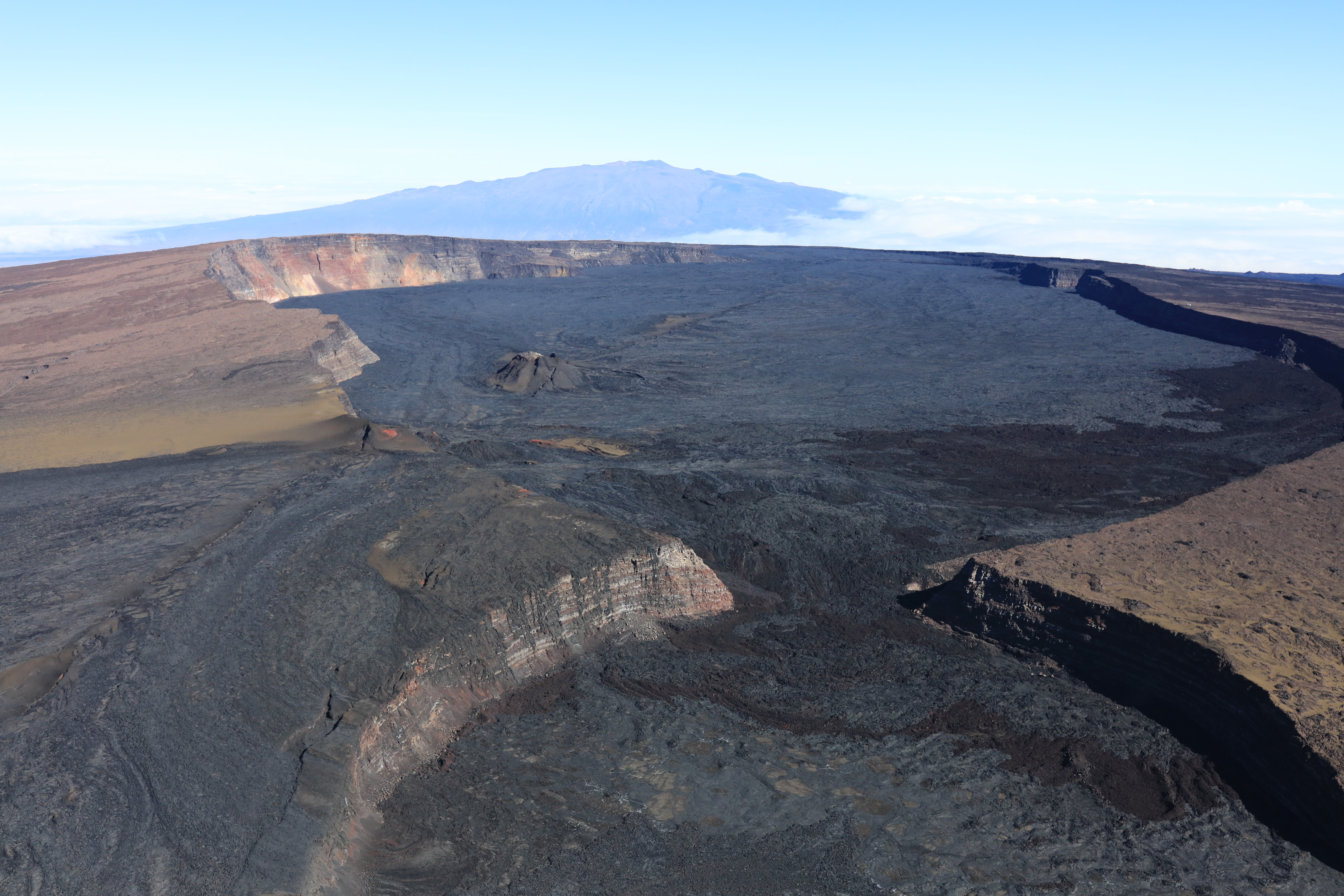 On Tuesday, December 23, USGS Hawaiian Volcano Observatory scientists completed a helicopter overflight of Mauna Loa's summit and upper rift zones. This photo—captured looking north-northeast—shows South Pit (foreground) and Moku‘āweoweo caldera (middle distance) with Mauna Kea looming behind. USGS photo by M. Zoeller.