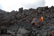 A USGS Hawaiian Volcano Observatory geologist collects clinker from a rubbly spatter-fed lava flow in Halema‘uma‘u crater produced during episode 38 lava fountaining. These lava samples are collected with permission from Hawaiʻi Volcanoes National Park and analyzed in the lab to better understand the magmatic system of Kīlauea. The scientist, who is about 6 feet (2 meters) tall provides a scale for how thick this lava flow is. USGS photo by C. Sealing.