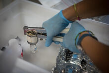 USGS scientist Nancy Prouty seals the vials containing water samples