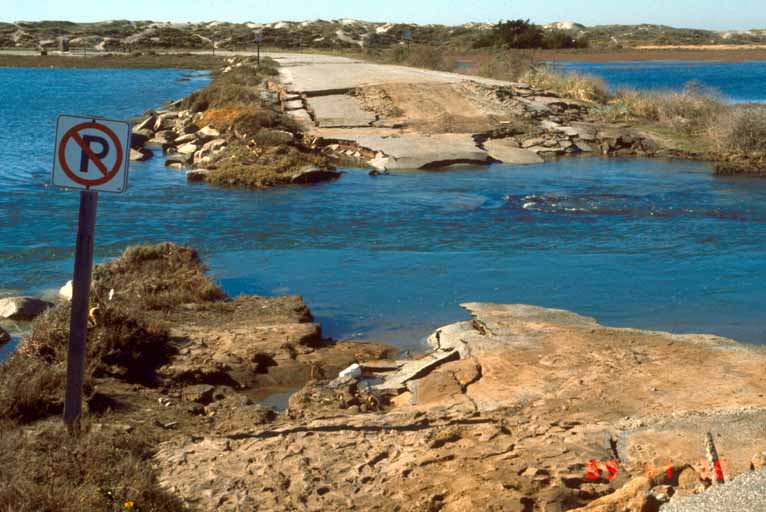 Liquefaction and subsequent strong tidal action destroyed a causeway carrying the Moss Beach access road across tidewater basin near Moss Landing.