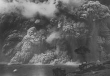 Detail of probably the largest explosion of the eruption, taken from Uēkahuna Bluff. Note gas-thrust uprush on the right, dust rising from block impacts on the caldera floor and blowing toward the rising hot explosion column, streamers of ash and gas defining the trajectories of falling blocks on the left, and clouds probably developing from condensation of steam driving the eruption.