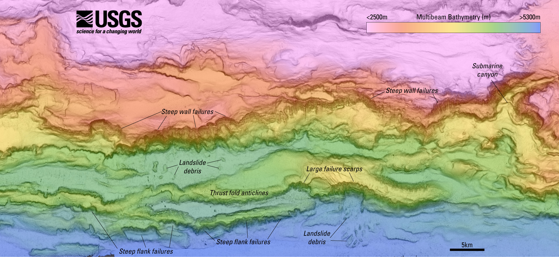 Detailed map showing seafloor features such as submarine canyons and slope failures offshore Kodiak Island, Alaska. Project page: Coastal and Marine Geohazards of the U.S. West Coast and Alaska.
