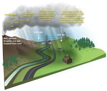Volcanic eruptions inject water vapour (H2O), carbon dioxide (CO2), sulfur dioxide (SO2), hydrochloric acid (HCl), hydrofluoric acid (HF) and ash into the atmosphere. HCl and HF will dissolve in water and fall as acid rain whereas most SO2 is slowly converted to sulphuric acid (H2SO4) aerosols. Ash particles may absorb these aerosol droplets onto their surfaces. When ash falls to the ground, the soluble components (leachates) can by washed away by water, potentially resulting in changes to local water chemistry and hence quality. Chemical changes in the underlying soil can occur as a result of leaching of the aerosols coating individual grains and longer term from unstable glass particles (Cronin and others, 1996)