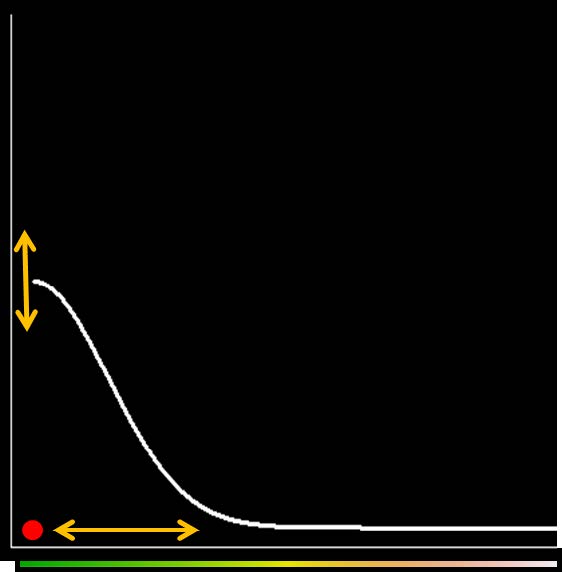 Fig. 2. Frequency of detection decreases with distance between trap and activity center. The color bar at the bottom of the figure depicts this relationship for one of the individuals in Fig. 1.