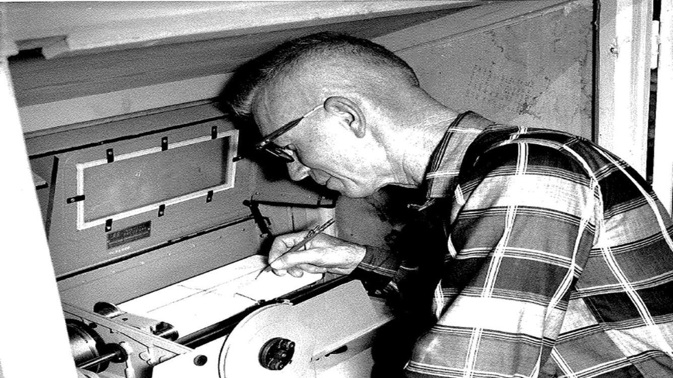 Don Rawlston making notes on water level recorder chart at USGS 4 in 1959.