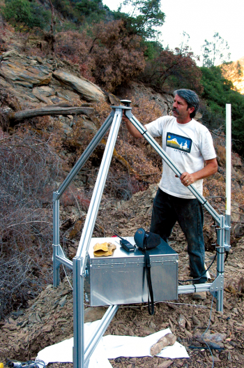Rick LaHusen of the U.S. Geological Survey, shown with one of the “spider” units he developed for use on active volcanoes. Spiders, which are outfitted with high-precision GPS and a seismometer, can be used for real-time monitoring of landslide activity and are usually deployed by helicopter sling-load.