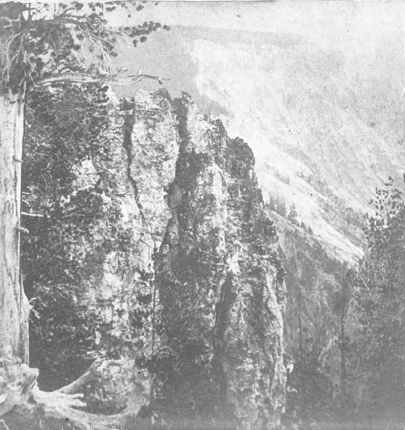 This view down the Grand Canyon of the Yellowstone shows large outcrops of altered volcanic rocks (rhyolite) and the forested plateau of the central eastern region of the park. In natural color, the rock ranges from bright yellow, orange, and red to brown.