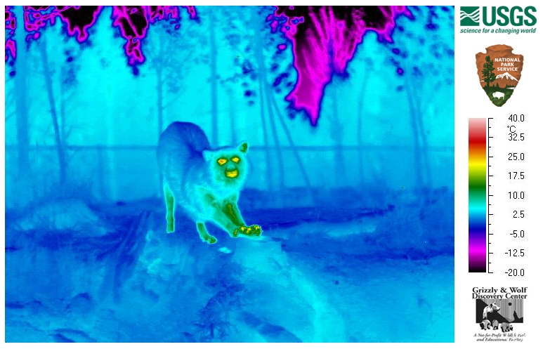 Adho mukha svanasana is the Sanskrit name for the downward facing dog yoga asana and this wolf shows how the pose got its name. The wolf's eyes, muzzle and paw tips are warm and yellow in this thermal image of a captive wolf at the Grizzly and Wolf Discovery Center in West Yellowstone. USGS scientists are examining thermal imagery of wolves as one step in assessing impacts of sarcoptic mange on the survival, reproduction and social behavior of this species in Yellowstone National Park. All research animals are handled by following the specific requirements of USGS Animal Care and Use policies.