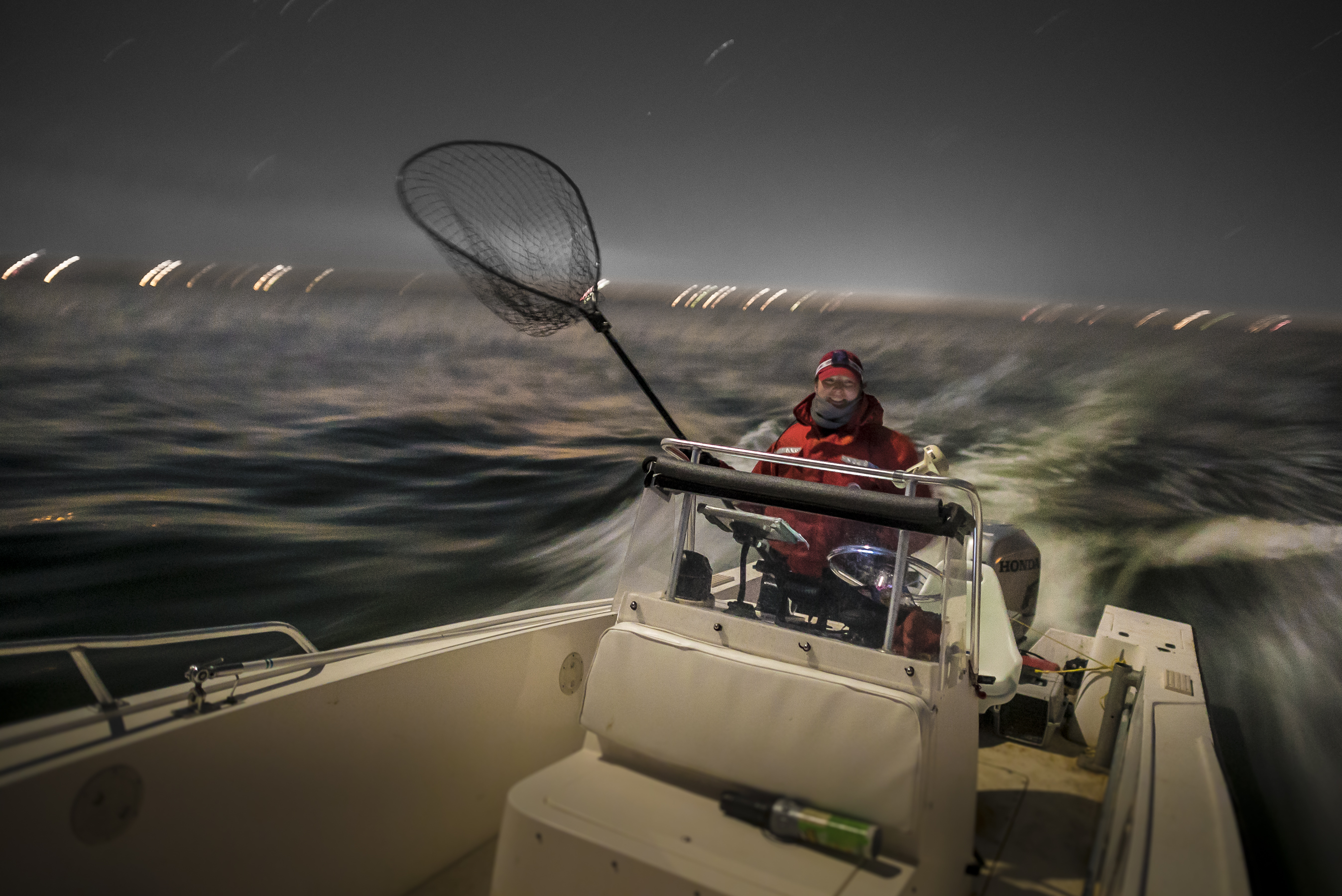 Dr. Alicia Berlin navigates a boat to capture scoters at night