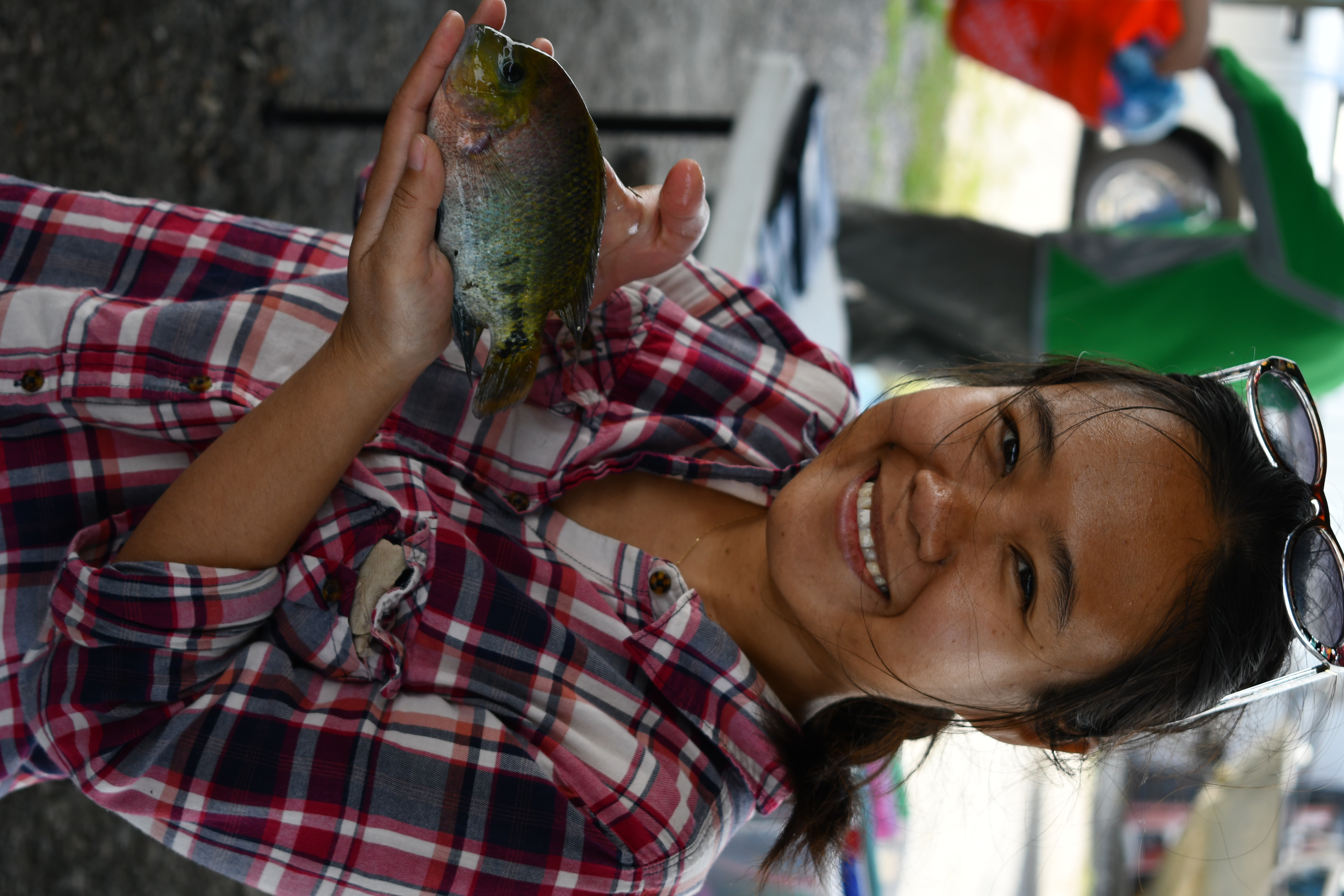Duangsamorn Boyd (LSU) with a redhead cichlid, Vieja melanura (Credit: Madison Sinopoli, LSU)