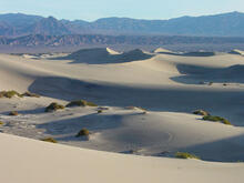 Morning view of the dunes near Stovepipe Wells. The Funeral and Grapevine Mountains rise in the distance. The Grapevine, Funeral, and Black Mountains are all part of the Amargosa Range that runs north-to-south along the east side of Death Valley.