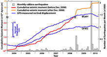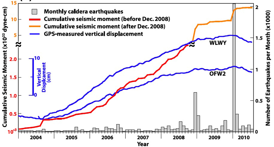 Uplift of GPS stations WLWY and OFW2 are shown as blue lines (compare with blue scale bar). The histogram (gray bars) shows the number of Yellowstone earthquakes per month (right Y axis), with most activity occurring during the period when the uplift began to slow.
