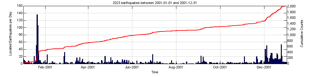 Earthquake activity plot at Yellowstone for the year 2001.