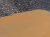 This close up photo shows the eastern portion of the water lake at Kīlauea's summit. In the upper right, the eastern end of the lake has a slightly greenish hue, which is common in this area.