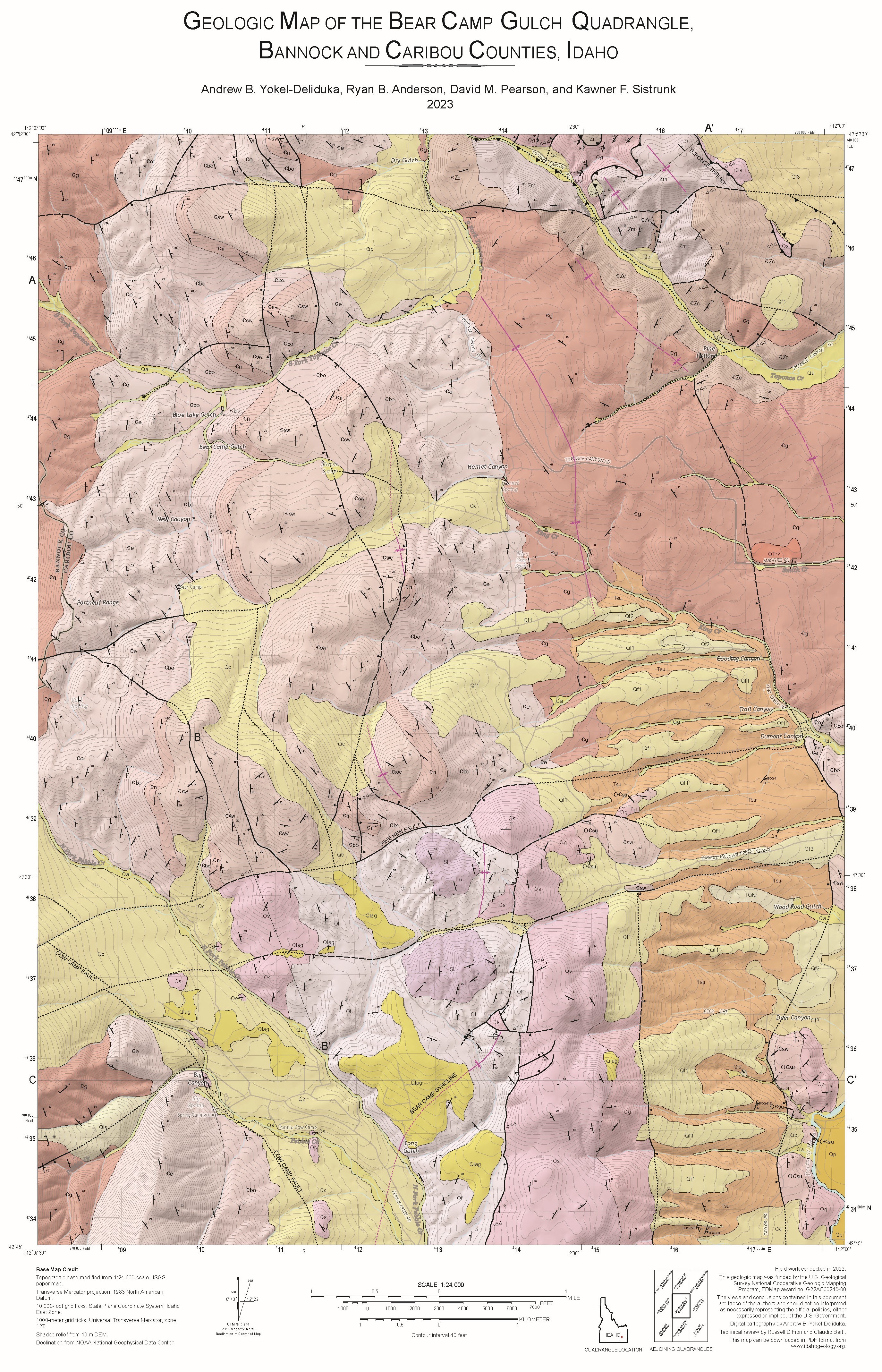 The Geologic Map of the Bear Camp Gulch Quadrangle started out as an EDMAP project at Idaho State University. EDMAP student Andrew Yokel-Deliduka worked with the Idaho Geological Survey to publish the map and presented it at GSA Connects 2024 to win the Best Student Geologic Map Competition. The image used here is an excerpt from the original product.