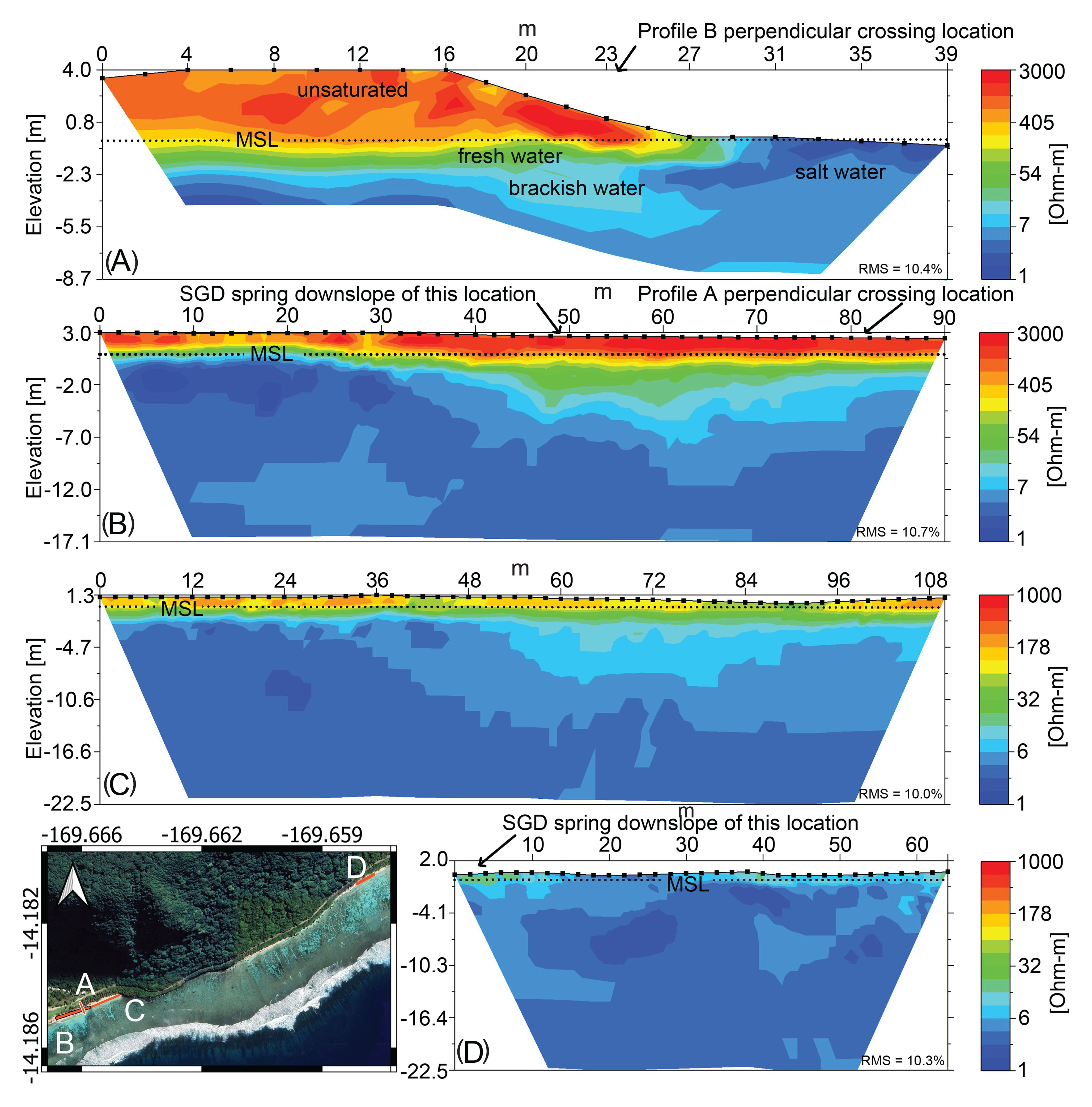 Electrical Resistivity Tomography (ERT) profiles at: (A) Papaloloa Point Center (shore perpendicular), (B) Papaloloa Point Center (shore parallel), (C) Papaloloa Point East, and (D) Fattuana Point. From the study Land-based nutrient flux to a fringing reef: insights from Ofu Island, American Samoa.