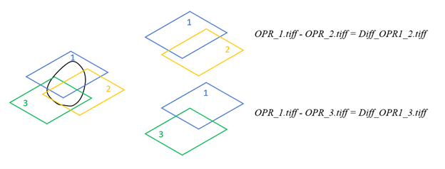 An elevation-derived hydrography project area shown in black with three overlapping source bare earth DEMs, OPR1, OPR2, and OPR3. OPR1 has the most recent data, so OPR2 is subtracted from OPR1 to create the first difference DEM, Diff_OPR1_2.tiff. Then OPR3 is subtracted from OPR1 to create the second difference DEM, Dirr_OPR1_3.tiff.