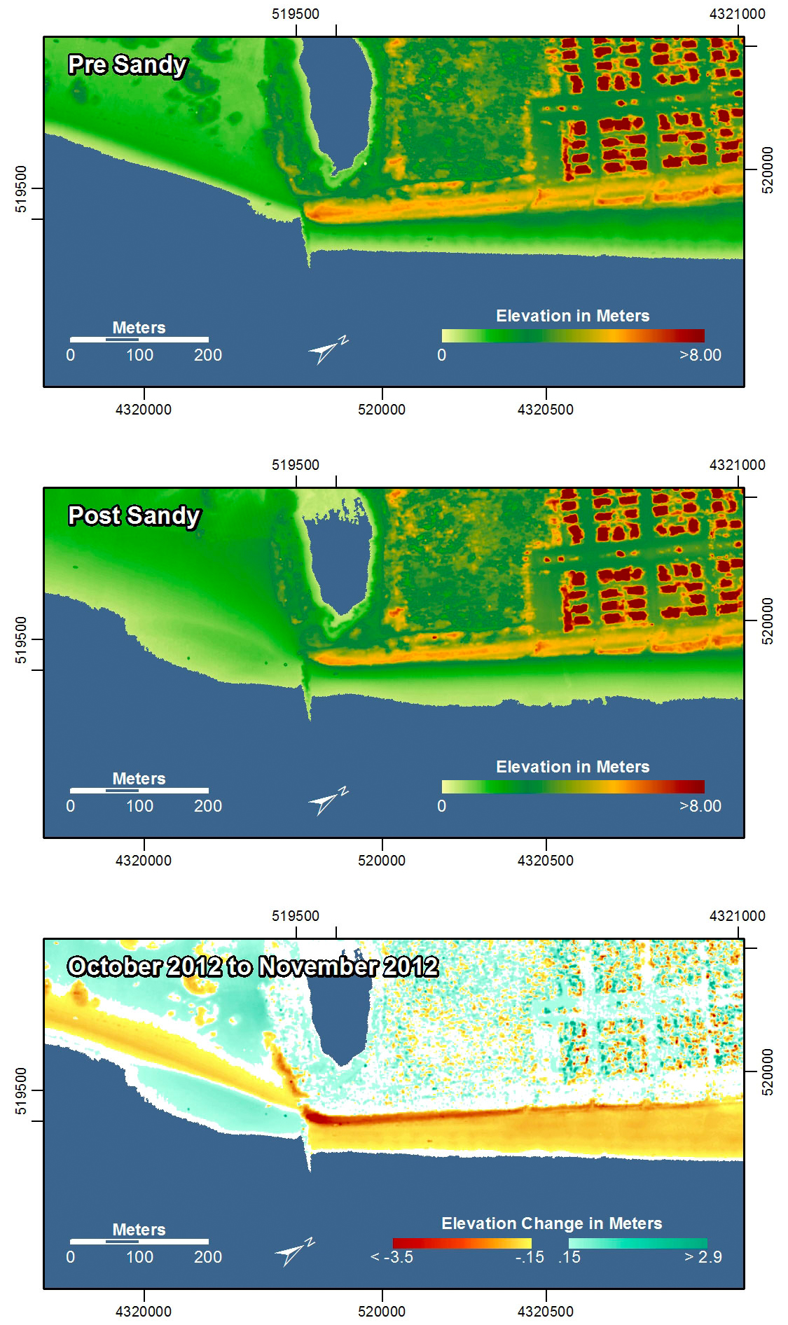 Pre-storm elevation map, post-storm elevation map, and elevation difference map of Stone Harbor Point, New Jersey. On the right side of the image, north of the groin, the beach and seaward facing edge of the dunes were eroded, showing a typical example of the collision regime. On the left, south of the groin, the beach was flattened and widened by storm surge and waves overwashing the area.