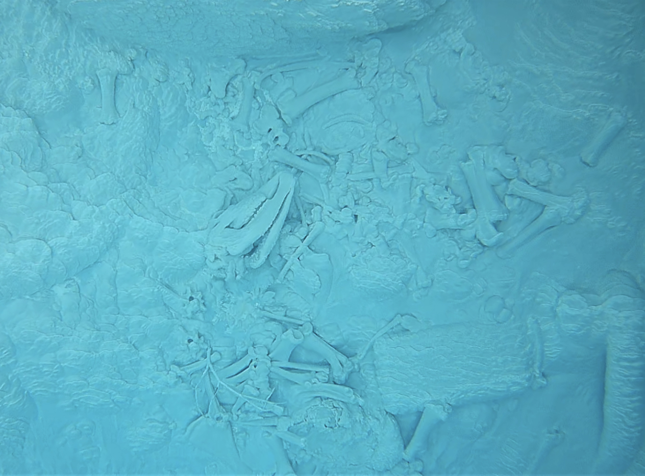 Elk skeleton at the bottom of Doublet Pool on Geyser Hill near Old Faithful, imaged by an underwater camera in 2022. Photo by Mara Reed, University of California, Berkeley, under research permit YELL-2022-SCI-8058.