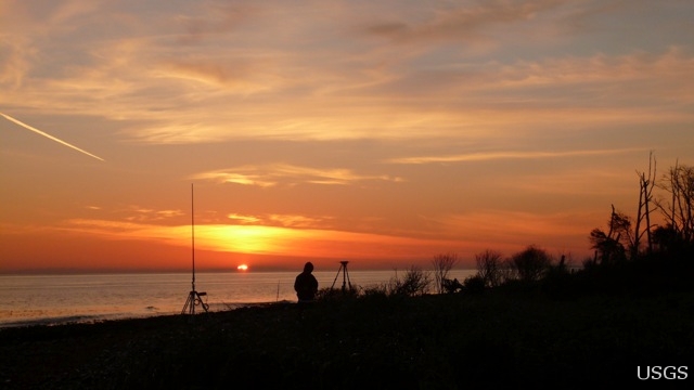 Base stations along the Elwha River delta are placed on fixed monuments early in the morning so that they can provide GPS corrections all day during the surveys.