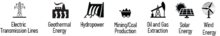 Icons for transmission lines, geothermal energy, hydropower, mining/coal production, oil and gas extraction, solar energy, and wind energy.