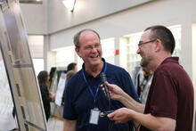 Posters from South Dakota State University and University of South Dakota college students and EROS staff members line the atrium November 13, 2024, for the Fall Poster Session at the USGS Earth Resources Observation and Science (EROS) Center. Brent Johnson, a KBR contractor at EROS, tells Adamson about the uncrewed aerial system (UAS) or drone imagery archived at EROS, which includes lidar imagery.