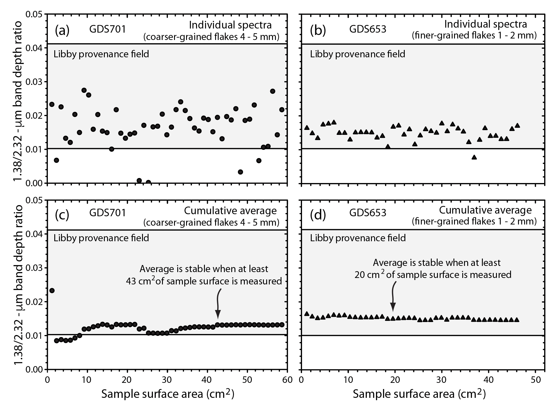 Figure A10. Evaluation of the total surface area of an expanded vermiculite ore sample that must be spectrally measured to derive a precise average 1.38/2.32-μm band-depth-ratio value for source determination.