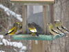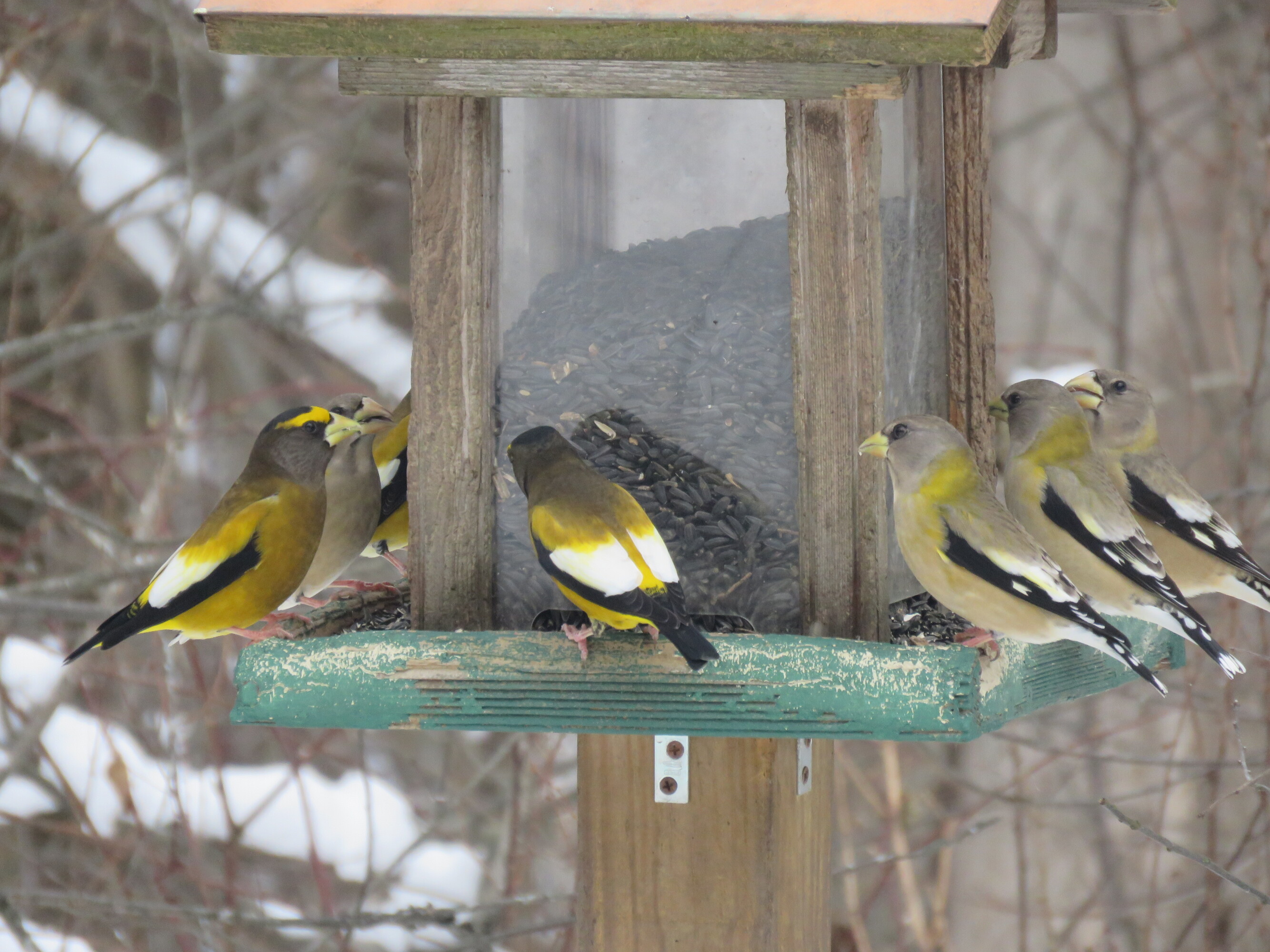 A flock of Evening Grosbeaks at a feeder during the winter.