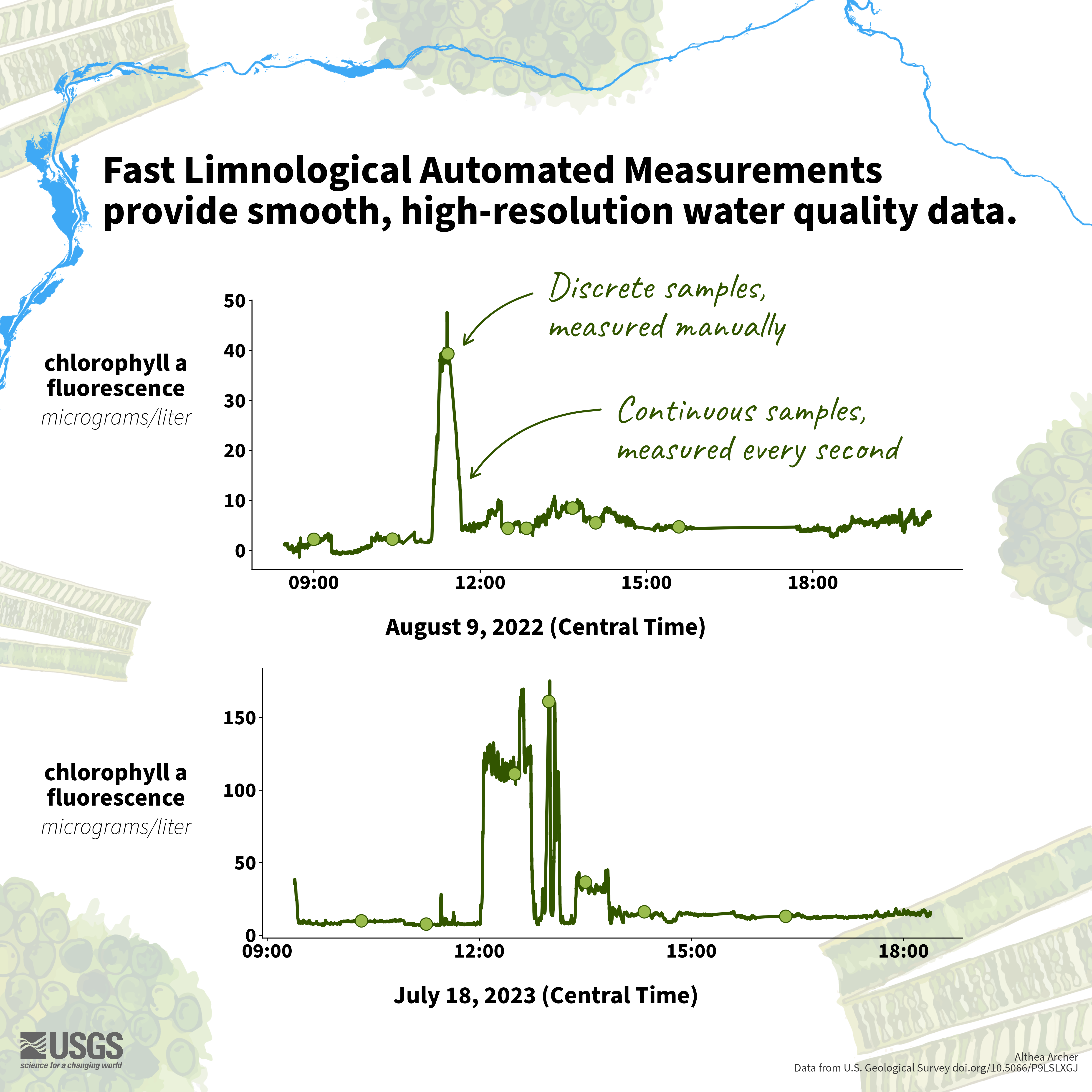 These data were collected along the Illinois River to improve predictions of carbon and nitrogen dynamics in the waterway. Ten onboard high-tech instruments collected up to 95 variables over the course of five sampling campaigns between May 2022 and July 2023.