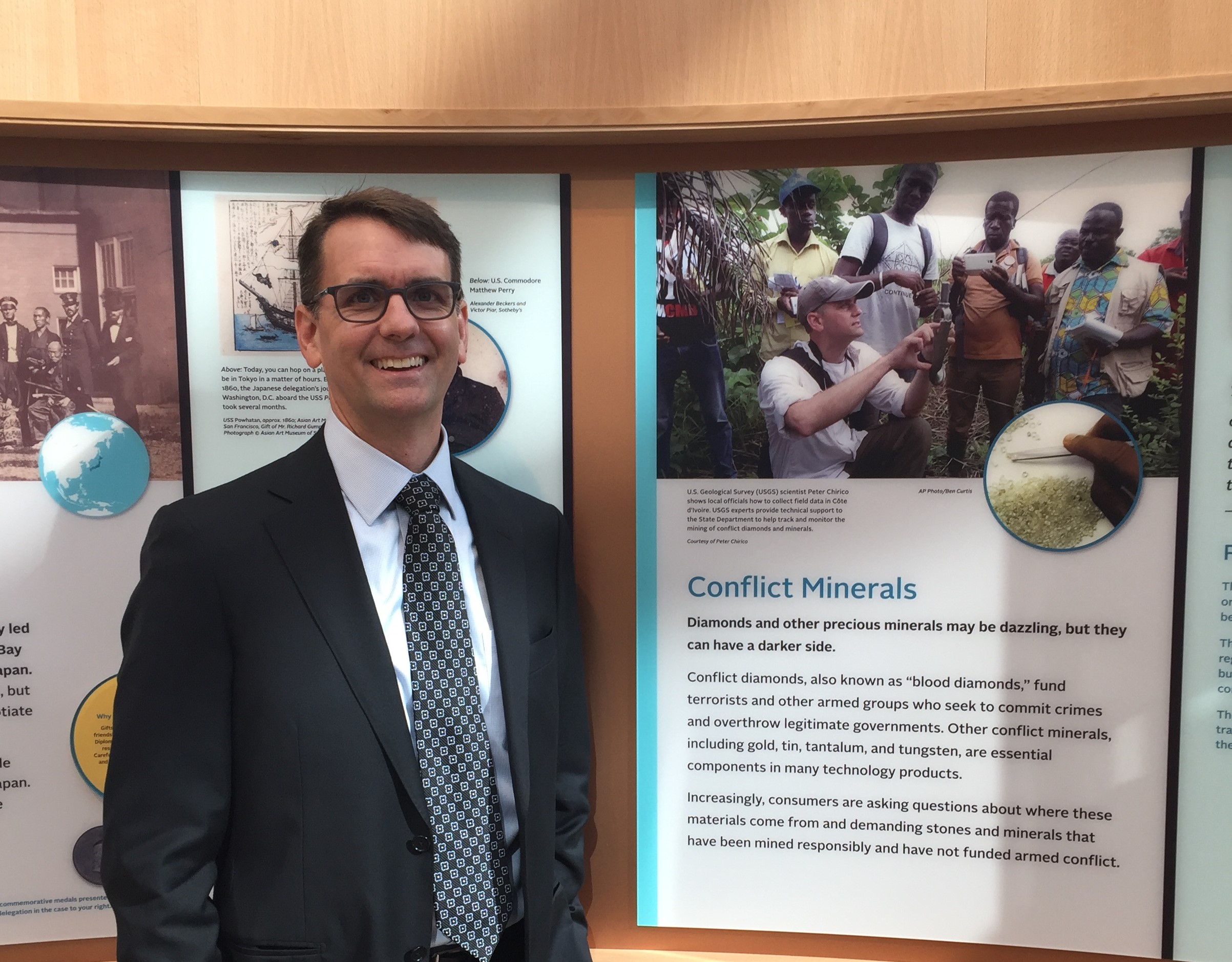 On November 7th 2019, The U.S. Department of State opened its National Museum of American Diplomacy (https://diplomacy.state.gov/about) and unveiled its first exhibits telling the story of American diplomacy. USGS Florence Bascom Geoscience Center (FBGC) Scientist and Associate Director, Peter Chirico, is highlighted in the exhibit, for his Science Diplomacy work serving as Scientific and Technical Advisor to the Office of Threat Finance Countermeasures in the Department of State's Bureau of Economic and Business Affairs. Since 2007, the FBGC Special Geoscience Studies Project has been supporting the U.S. Department of State in preventing the mining of diamonds and minerals from being used to fund armed groups, criminal networks, and terrorist organizations by applying satellite imagery and geomorphological field mapping techniques to detect and monitor small-scale mining activities in conflict zones globally. The exhibit will be open to the public for scheduled tours on Fridays at 10 amand 1 pm at 330 21st Street, NW, Washington, D.C. 20006 (https://diplomacy.state.gov/ticketing).