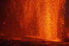 A telephoto view of the south vent fountain, taken from the south rim of Halema‘uma‘u crater at night on February 15, 2026. Molten clasts falling near the base of the fountain were feeding a channelized flow that carried lava into the eastern portion of the crater. Those clasts falling slightly to the south (left side in this photos) were accumulating and feeding a slowly moving spatter-fed ‘a‘ā flow along the south rim of the crater floor. USGS photo by M. Patrick.