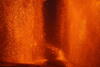 A telephoto view of the base of the two lava fountains, and the narrow gap that was present between them, during episode 42 of the Kīlauea summit eruption on February 15, 2026. On the south side of the north fountain (right), a very small third fountain was active, with frequent bubble bursting. USGS photo by M. Patrick.
