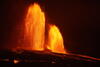 This night-time photo shows north and south vent lava fountains at the summit of Kīlauea, from the south rim of the Halema‘uma‘u crater. The south fountain (left) was fluctuating in height over timescales of seconds. At the bottom of the photo, a spatter-fed ‘a‘ā flow slowly advances, with clinker collapsing along its front. USGS photo by M. Patrick.