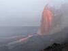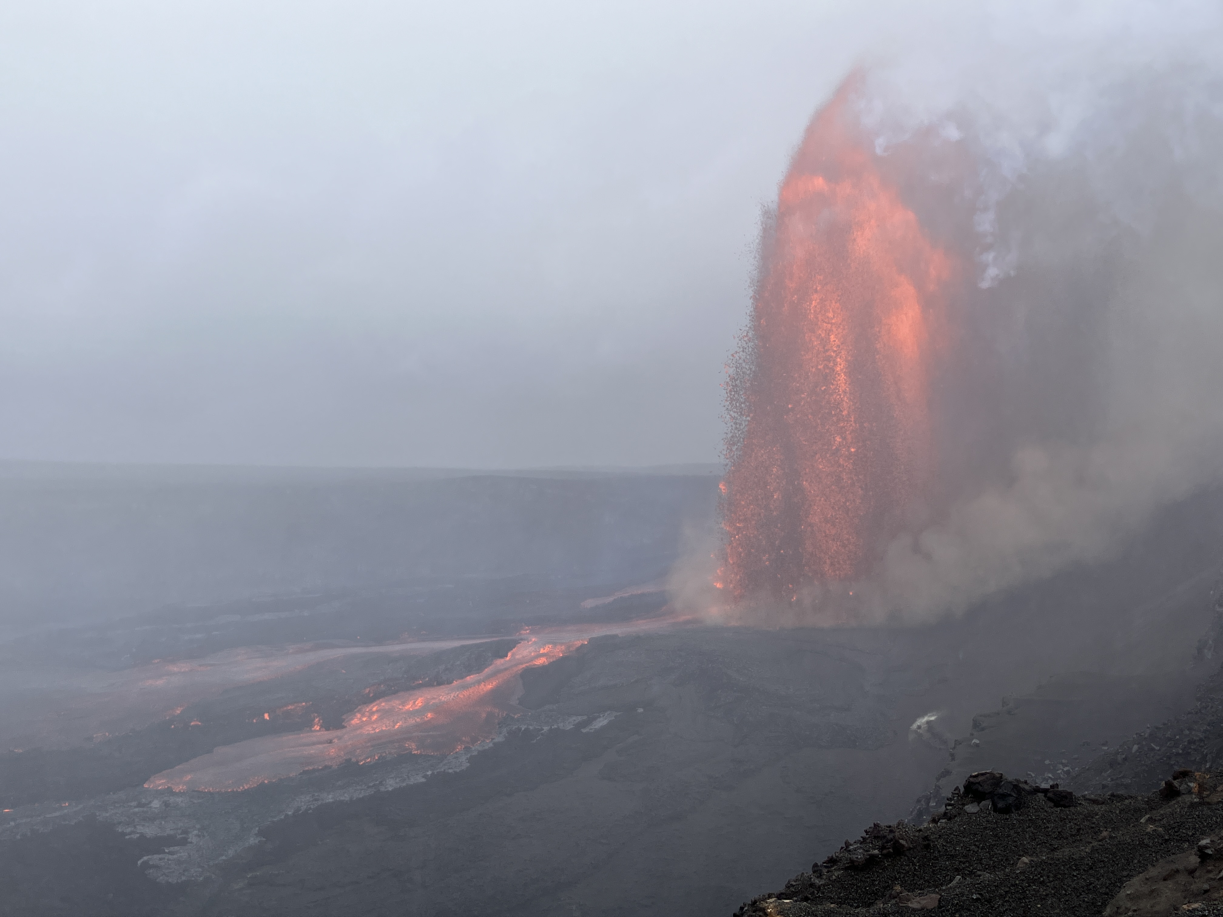 On Sunday, February 15, USGS Hawaiian Volcano Observatory scientists monitored episode 42 of the Kīlauea summit eruption from the northwest rim of Halema‘uma‘u crater. Despite driving rains, this location provided good views of the north vent's lava fountains and flows on the crater floor. Around 4:20 p.m. HST in the afternoon, scientists witnessed a dramatic redirection of the vent's main lava channel; earlier, most lava was flowing toward the center of the crater floor, but over the course of a few minutes it shifted into the northwestern section. In this photo captured almost immediately after the redirection began, the new channel alignment is in the early stages of formation, with fast-moving lava flows advancing down the slope from the vent. Subsequent analysis of time-lapse webcam imagery indicated that the shift was caused by slow slumping of the entire flank of the vent complex, resulting in a failure of the original channel levee on the north side. USGS photo by M. Zoeller.