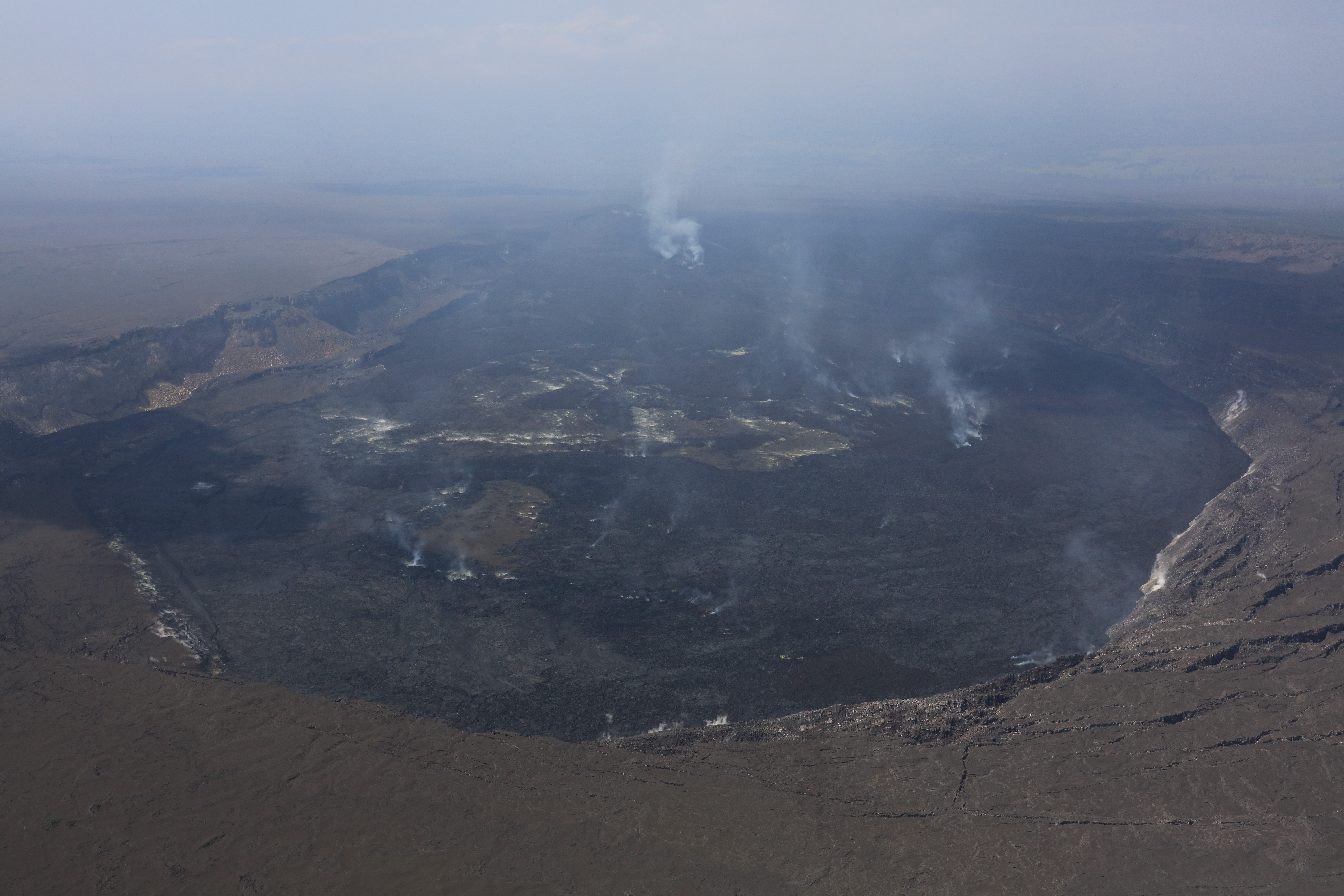 On Thursday, February 26, USGS Hawaiian Volcano Observatory scientists completed a monitoring helicopter overflight of Halema‘uma‘u crater at the summit of Kīlauea. As seen in this overview photo of the crater looking to the west-southwest, conditions were extremely hazy during the flight, presenting a challenge as the scientists attempted to capture mapping photos. USGS photo by M. Zoeller.