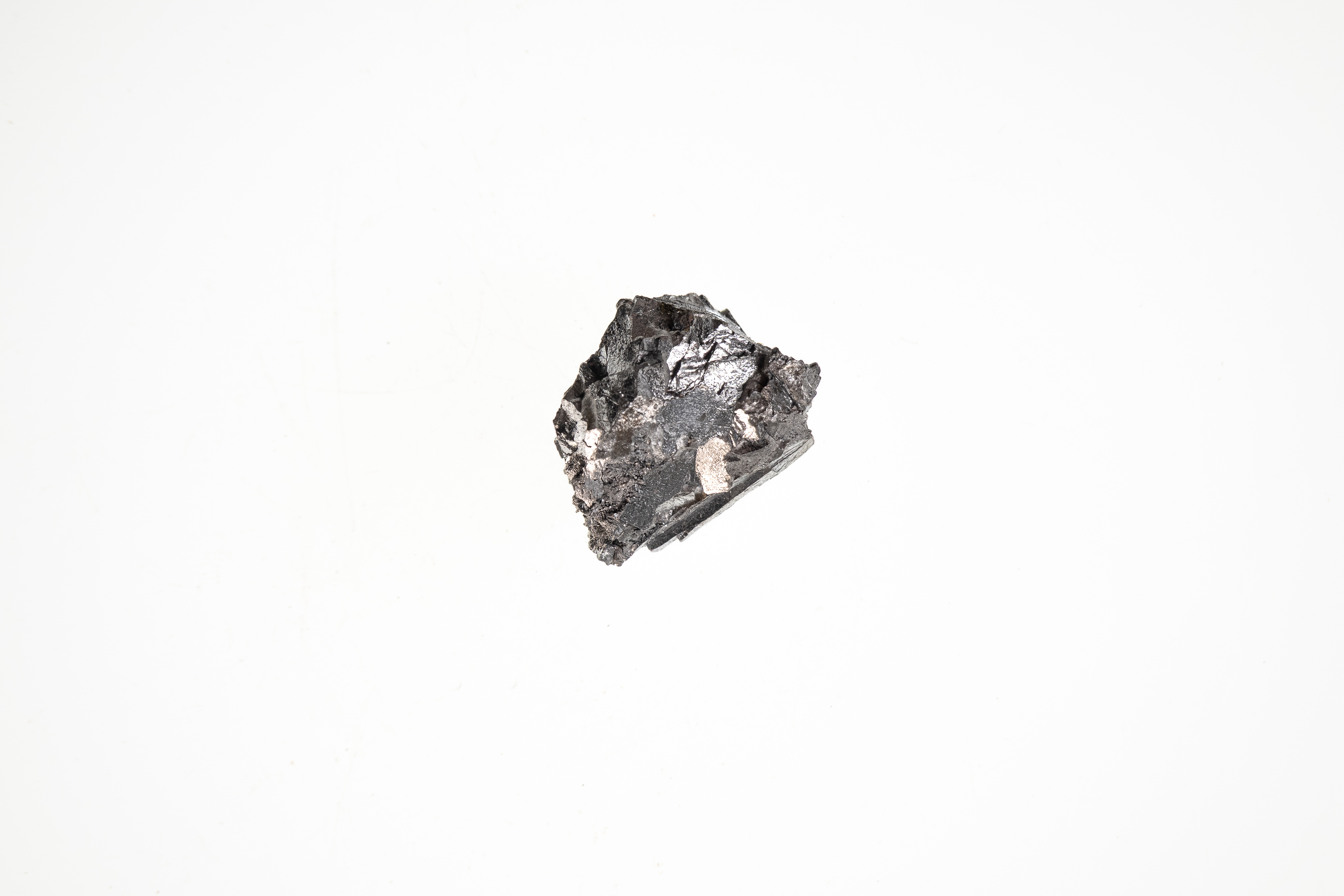 Isolated USGS mineral specimen of low-carbon ferrochromium. High-definition image showing smooth metallic surface.